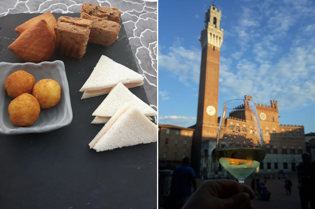 Posledním vzpomínkovým městem byla Siena. Pokud je Florencie královnou Toskánska, Sienna je princezna. Až na tu děsivou prázdnotu a brzké zavírání byla pořád stejně krásná, jakou jsem si ji pamatovala. Ověřili jsme si tam také, proč cestování nikde nemůže umřít a proč ho nikdy nenahradí google mapy. V primární potřebě najít záchod jsme si sedli ke stolečku v jedné z mnoha kaváren/restaurací přímo na hlavním náměstí. Jen na skleničku, trochu si užít ten moment, že sedíte přímo na paliu a kocháte se tou nádherou i přesto, že ještě v květnu člověk seděl doma zabarikádovaný a div ne k smrti vyděšený, co jako bude. Obsluha byla neskutečně pomalá, už jsme skoro i odešli, nakonec jsme si ale objednali každý jeden nápoj, jen na osvěžení. K našemu překvapení kromě pití donesli i něco, co bych se svými zkušenostmi přirovnala ke španělskému tapas – několik typů různých jednohubek. Takže jsme to neplánovaně sfoukli i s večeří. Tohle z fotek nepoznáte, tohle vám virtuální realita nezprostředkuje – ten autentický zážitek a překvapení, že v té přepálené ceně není pouze sklenička vína, ale i něco na zub.