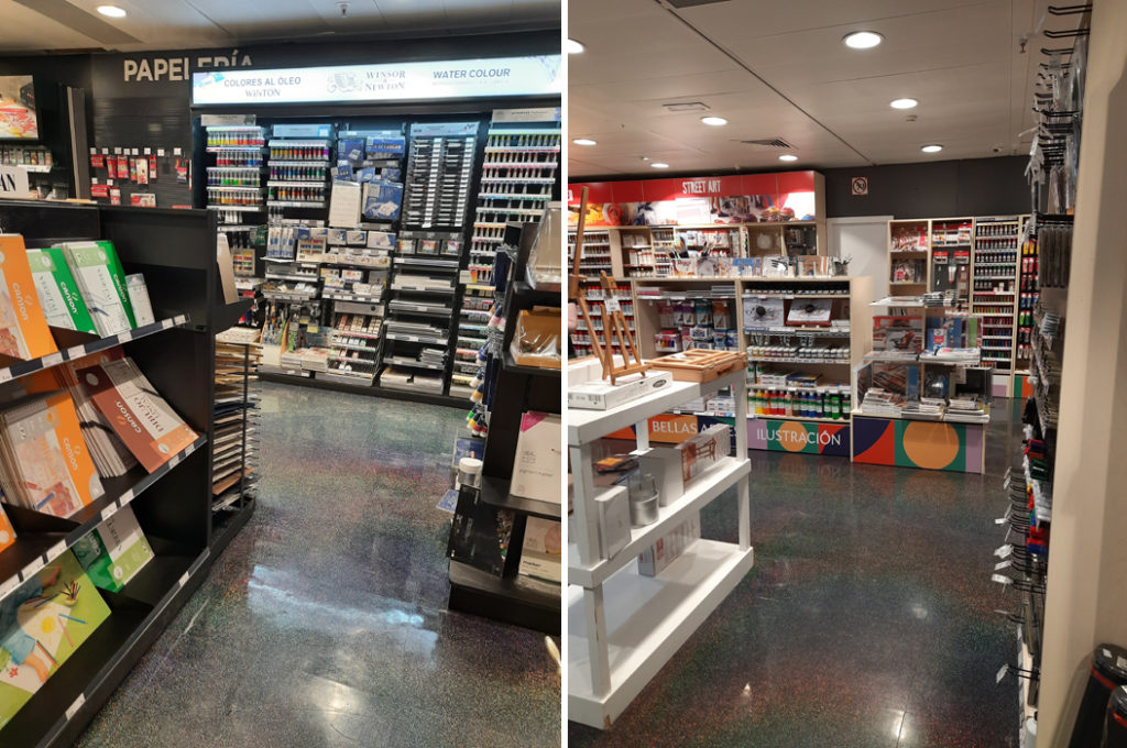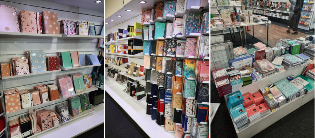 Jdeme na méně reprezentativní korporáty, ale co se papíru týče, je to návštěva velmi uspokojivá. „fnac“ je něco mezi knihkupectvím, prodejnou elektroniky a právě i papírnictvím. El Corte Inglés vždy přirovnávám třeba ke Kotvě nebo starému Máji, tedy obří obchodní dům, kde je směs různých prodejců, koupíte tu i oblečení, boty, elektroniku, knihy a já nevím co ještě všechno dalšího. Ve správném patře obou pak najdete nepřeberné množství diářů, zápisníků výtvarných a psacích potřeb.