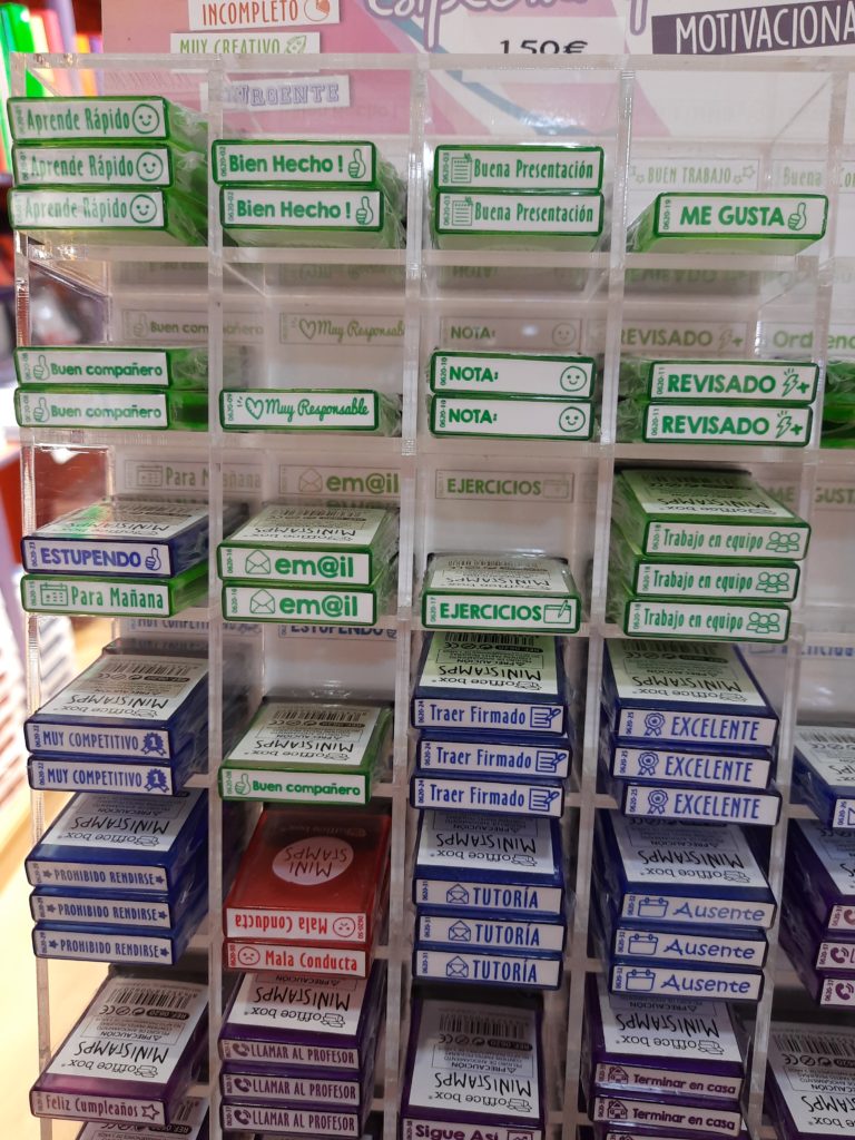 Přesouvám se od jiné části města. A i do úplně jiného typu podniku. Tohle bylo klasické české papírnictví. Asi bych ho úplně vynechala, ale i tady jsem našla zajímavost. Mezi běžnými sešity, propiskami a balícími papíry se schovával stojan s razítky. Nic dechberoucího, ale pro milovníky razítek, španělštináře, popřípadě učitele španělštiny určitě věc užitečná – malé textové radosti.