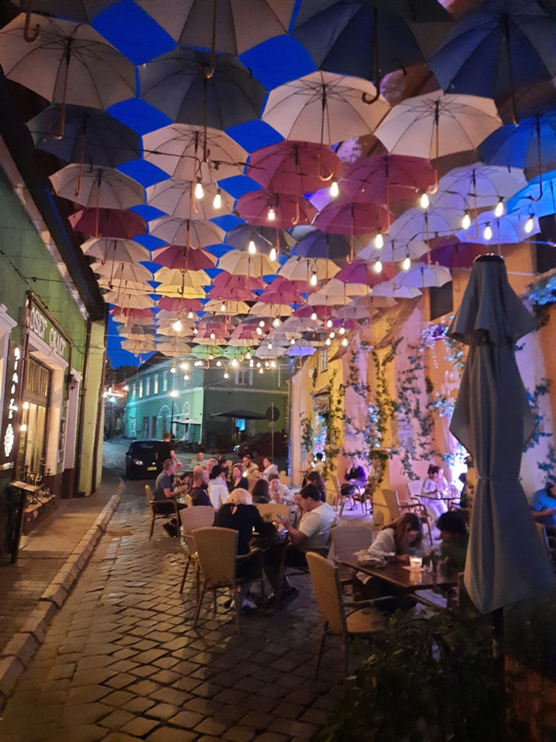 Navečer jsme dojeli do další cílové destinace, kterou bylo město Sibiu. Byla jsem předpřipravená, že prý nic moc, ale nakonec mě večerní Sibiu naprosto okouzlilo. Možná to bylo právě tou denní, respektive noční dobou, kdy se ven vyvalily davy lidí, kteří posedávali všude, zejména na mnohých schodech, popíjeli, hráli na různé nástroje a bavili se. Mělo to atmosféru toskánských večerů.