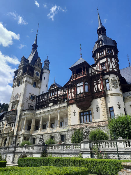 Po protažení a provětrání jsme pokračovali dál, objeli cílový Brašov a zamířili do hor do Sinaie. Hnízdo, které můj Muž popsal ne zcela korektně, ale podstata byla o lidech v teplácích ověšených zlatými řetězy. Prý perla Karpat… No nevím, kolony tam i zpátky, všude mraky lidí, turistické pasti… Neoslovilo nás. Trochu nám to připomínalo Karlovy Vary s honosnými vilami, kterým vévodil zámek Peleş.