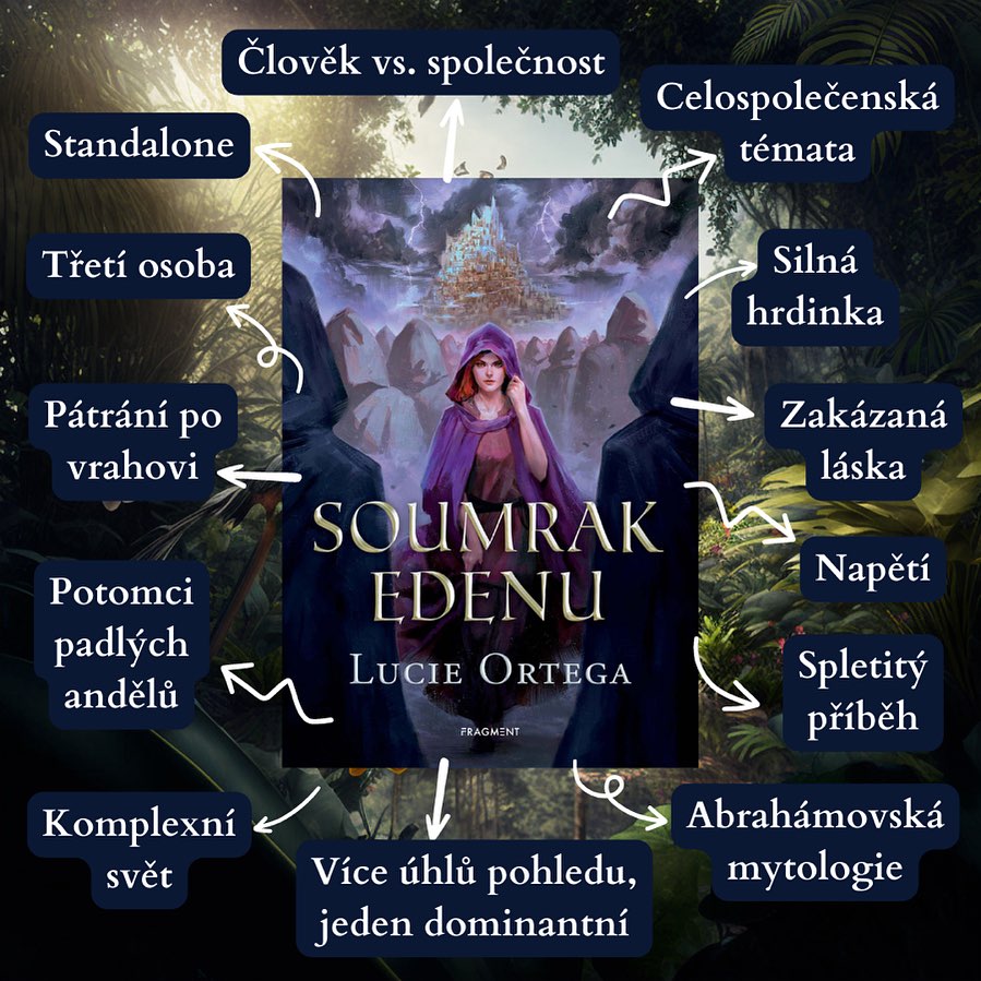 Absolutně mě nadchla volba tématiky. Základem je tady abrahámovská mytologie, biblické motivy, ale všechno je podané tak krásně uvěřitelně, tak realisticky, že jsem jen zírala, jak dokonale to všechno vlastně fungovalo. Jsem zvyklá, že s těmito motivy hodně pracují americké autorky (Cassandra Clare se svými Nephilim mluví za vše), v českém rybníčku jsem tohle asi ještě nepotkala. Což je ale zcela určitě způsobeno spíše mou ignorací. Obecně českou fantasy čtu velmi zřídka a velmi opatrně, protože z ní cítím něco, co mi nesedí. Ale tady… Tady jsem se několikrát přistihla u svých typických zamyšlení „jak to asi bylo řečeno v originálu?”, aby mi záhy došlo, že já to ale čtu v originálu. Tak dobré to bylo. Nechápejte mě teď špatně, věřím, že česká literatura se zlepšuje, Soumrak Edenu už jednoznačně zapadá do velkého stylu moderní fantastiky. Jinými slovy – je to dílo na světové úrovni. Zasloužilo by si překlad a rozhodně by si získalo i zahraniční čtenáře. A rozhodně by si to zasloužilo stejný fanbase jako některé velké zahraniční série, protože kvalitou je to nejen srovnatelné, ale místy i lepší.