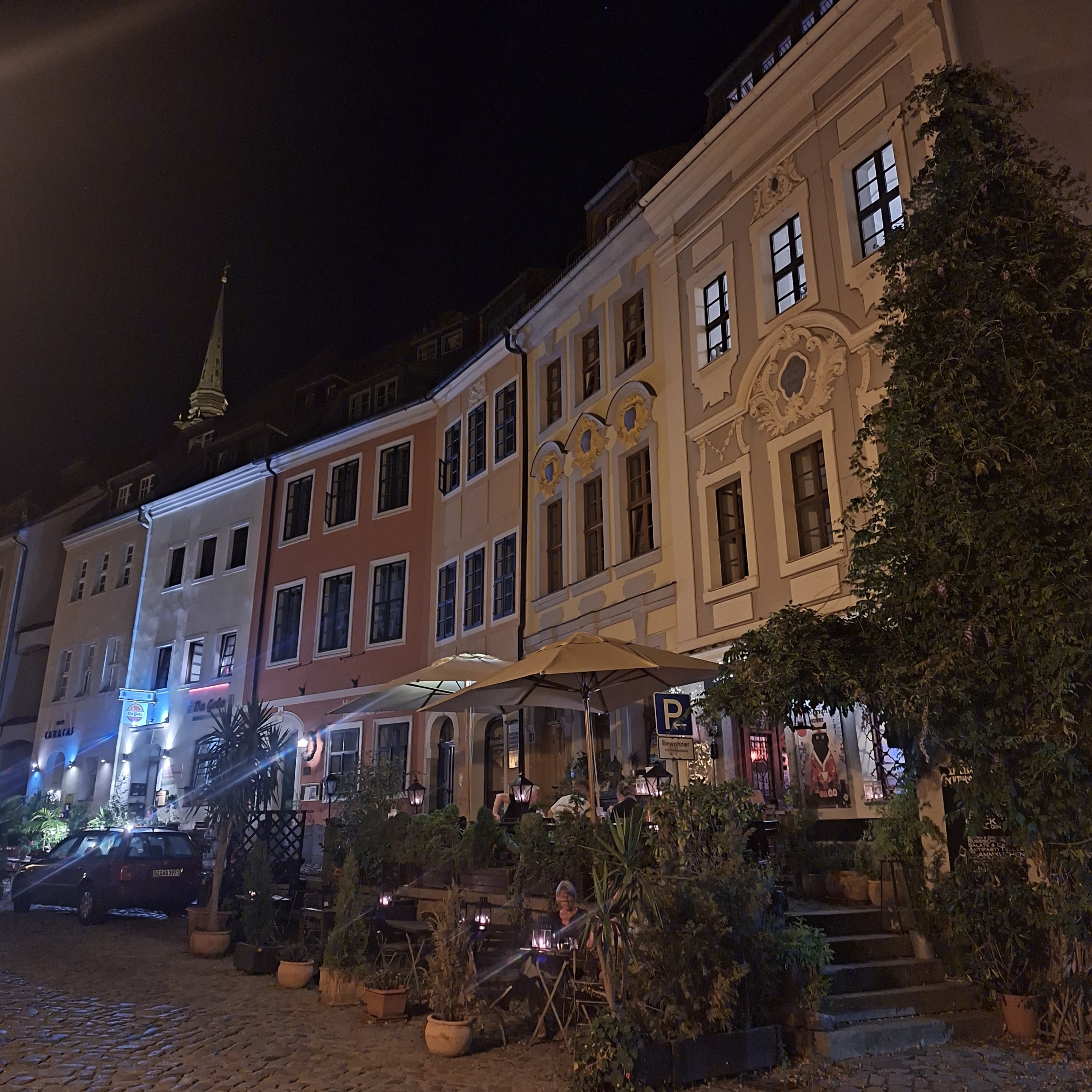 Téměř poslední zastávkou na našem mikrovýletu byl Budyšín. Upřímně mě tentokrát oslovil víc než před lety, kdy jsem ho navštívila v podzimních plískanicích. Čím tentokrát zabodoval nejvíc, bylo ubytování, které absolutně nechápu, jak se nám povedlo, ale skončily jsme v dvoupatrovém podkrovním apartmá pro čtyři lidi s obři, ale opravdu obří terasou v samém centru města. Jak moc centrum? Asi tak, že v osm večer i v Budyšíně ustává život a něco k jídlu a místo k posezení se dá najít zjevně jen v jedné jediné uličce, Schloßstraße. A tam jsme bydlely. Stálo nás to teda dramatické scény s parkováním, kdy se nás paní z ubytování snažila s autem narvat do prostoru mezi tři olbřímí SUV a středověkou studnu, ale nakonec jsme celkem pohodlně zanechaly auto na hradním nádvoří (ne, dobrovolně bychom tam nikdy nevjely a nezaparkovaly, ale fakt to jde). Ale i parkovací drama stálo za to noční posezení na terase, všude hrobové ticho, jen zvony z kostelní věže a padající hvězdy (ještě stále padaly Perseidy). Myslím, že tohle se celkem bezpečně zapsalo mezi jedny z nekrásnějších vzpomínek a zážitků.