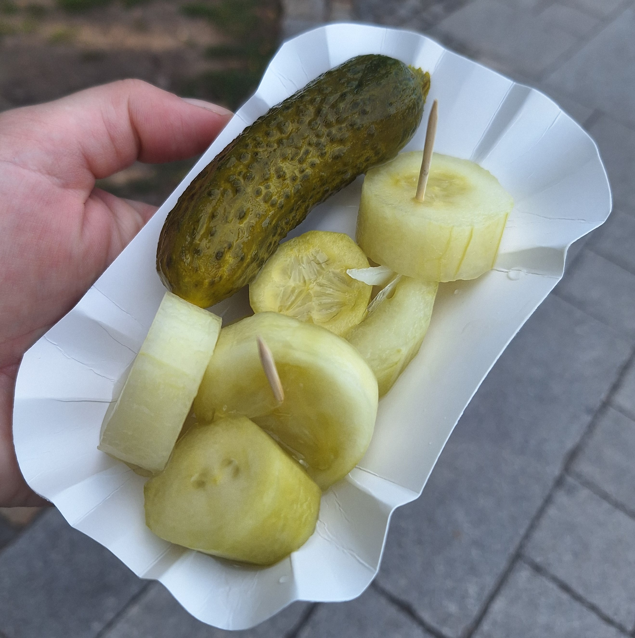 Po příjezdu jsme zastihly ještě pár posledních stánkařů, kteří otáleli s balením (šest večer, kolonáda zavírá) a v jednom prodávali okurky. Asi jako když u nás na poutích máte stánky s různými druhy koláčů a můžete si dát od každého kousek a ochutnat různé příchutě. Akorát s nakládačkami. Slané, česnekové, cibule s koprem, chilli, curry, medové… Takových deset druhů, všechny za stejnou cenu, prodáváno na váhu. Takže si řeknete, jakou chcete ochutnat, paní vám to hodí na tácek, nakrájí a dá párátka. A fakt si nepředstavujte hnusný nakládačky ze sámošky. Jsou výborné! Zejména medové a curry nás fakt dostaly.